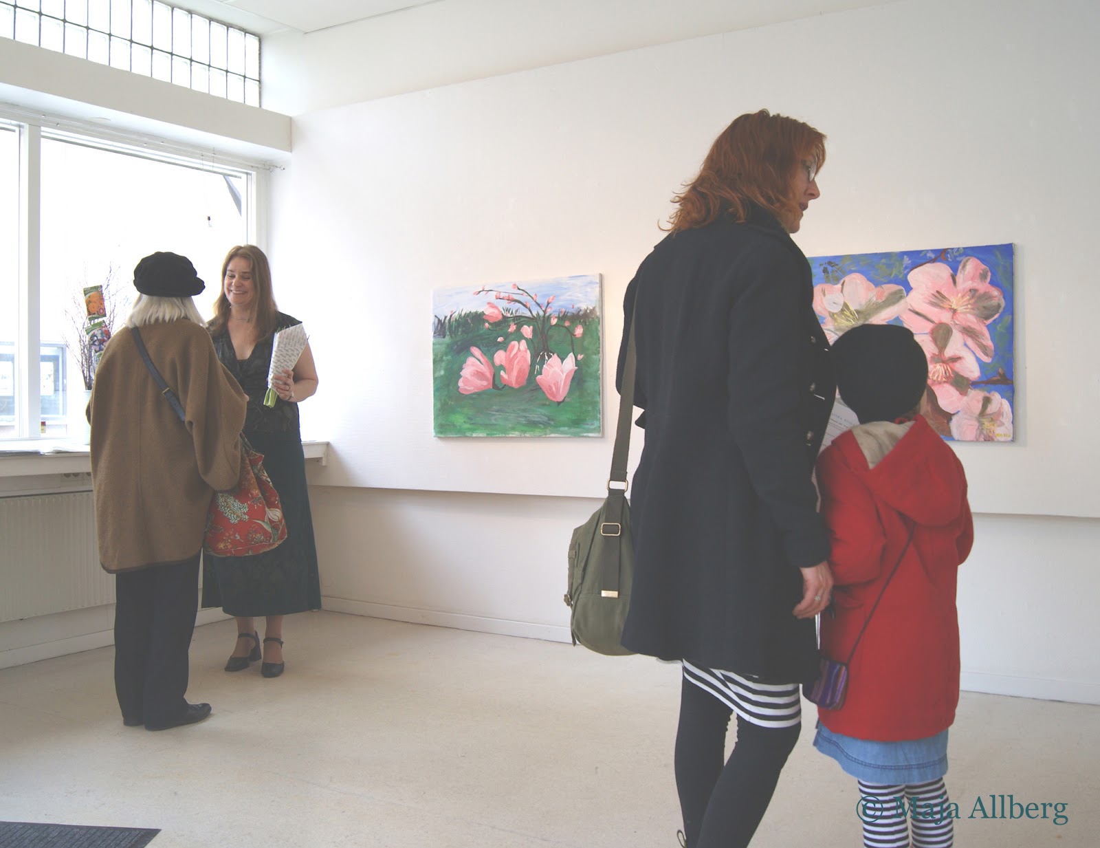 I diskussion med Astrid på vernissage-dagen, då även Marit med dottern Alice tittade in för att prata och lämnade en Svartöga som present: trevligt!